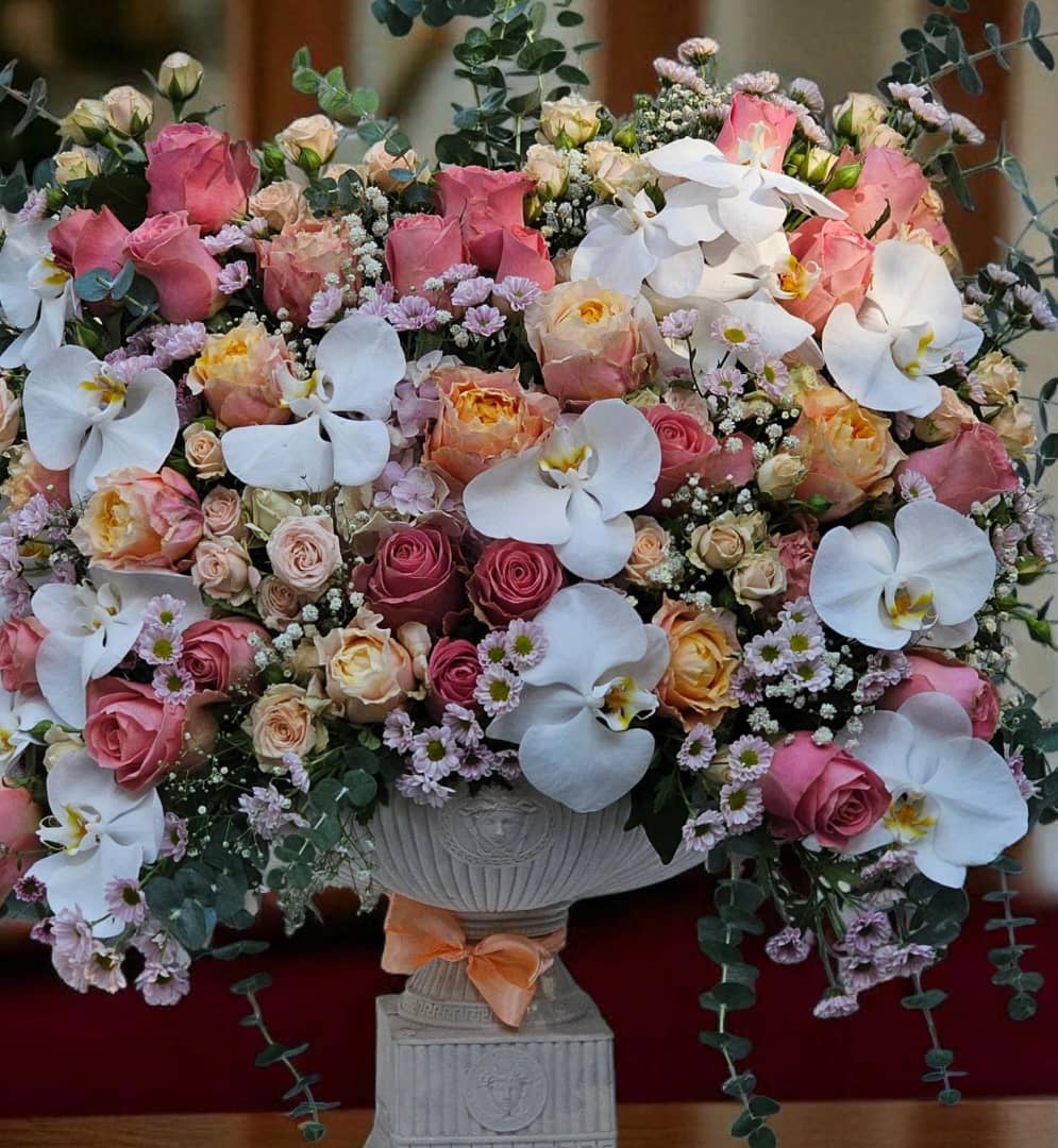 گلدان خواستگاری رنگین با گل‌های رز صورتی و ارکیده سفید، انتخابی خاص و منحصر به فرد برای مراسم خواستگاری.