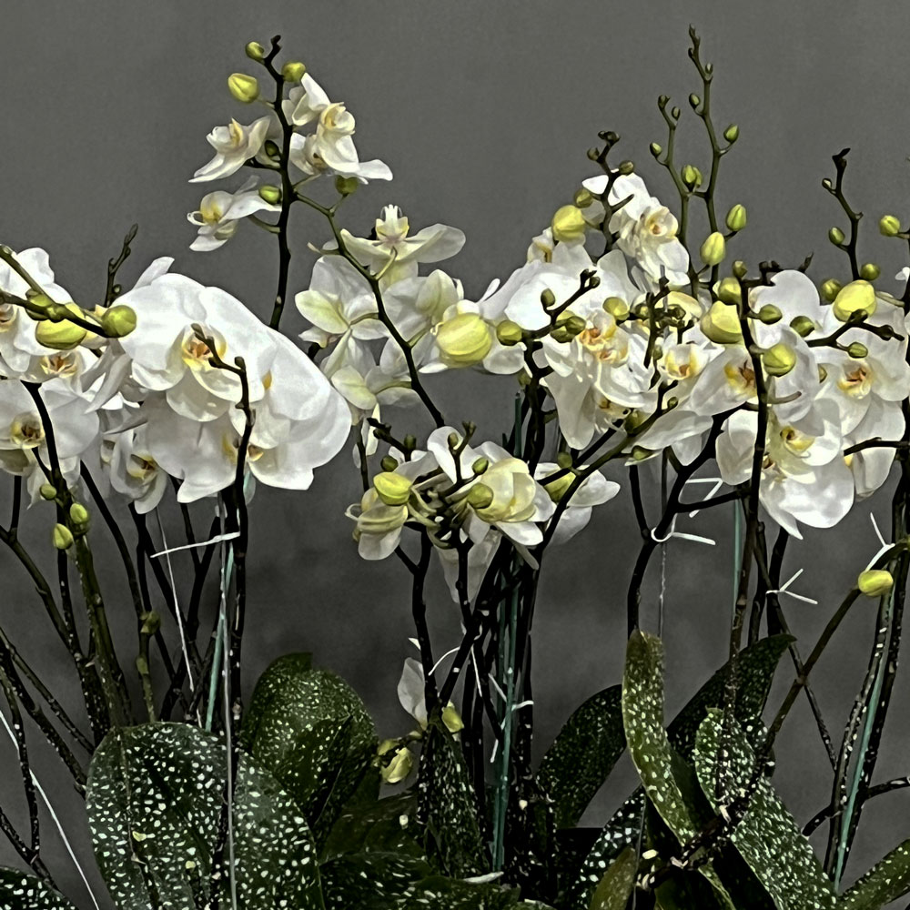 ارکیده سفید در گلدان سنگی خامهایدر این ترکیب، از گلهای ارکیده سفید گونه فالنُوپسیس استفاده شده است؛ گلهایی با جلوه سلطنتی و پر از حس آرامش. گلدان استفادهشده، از جنس سرامیک سنگنما و با رنگ خامهای گرم است که با بافتی طبیعی و فرم نیمدایرهایاش، حس زمین و ریشه را در کنار گلهای لطیف القا میکند. |