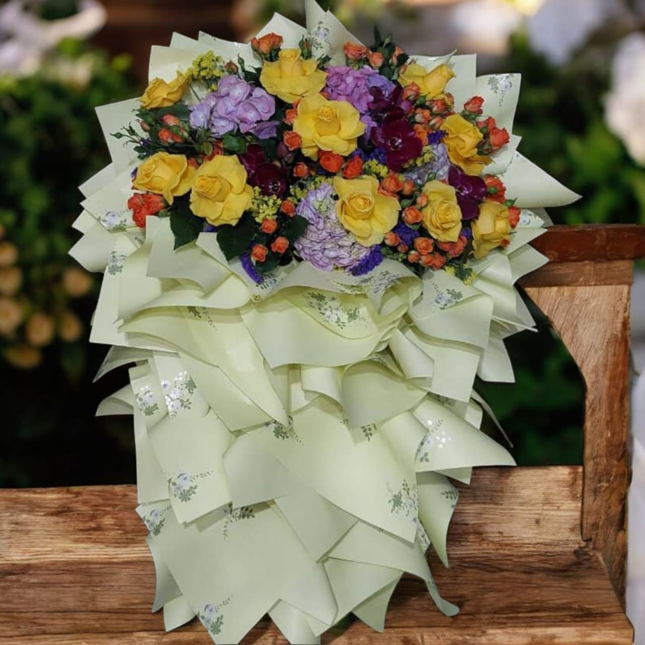 پایه استند از متریال مرغوب مانند چوب یا فلز ساخته شده و گلها بهصورت لایهلایه و متوازن روی آن چیده شدهاند. ارتفاع مناسب، حجم متعادل و ترکیب رنگی هوشمندانه باعث میشود این محصول در هر محیطی بدرخشد و توجهها را به خود جلب کند.