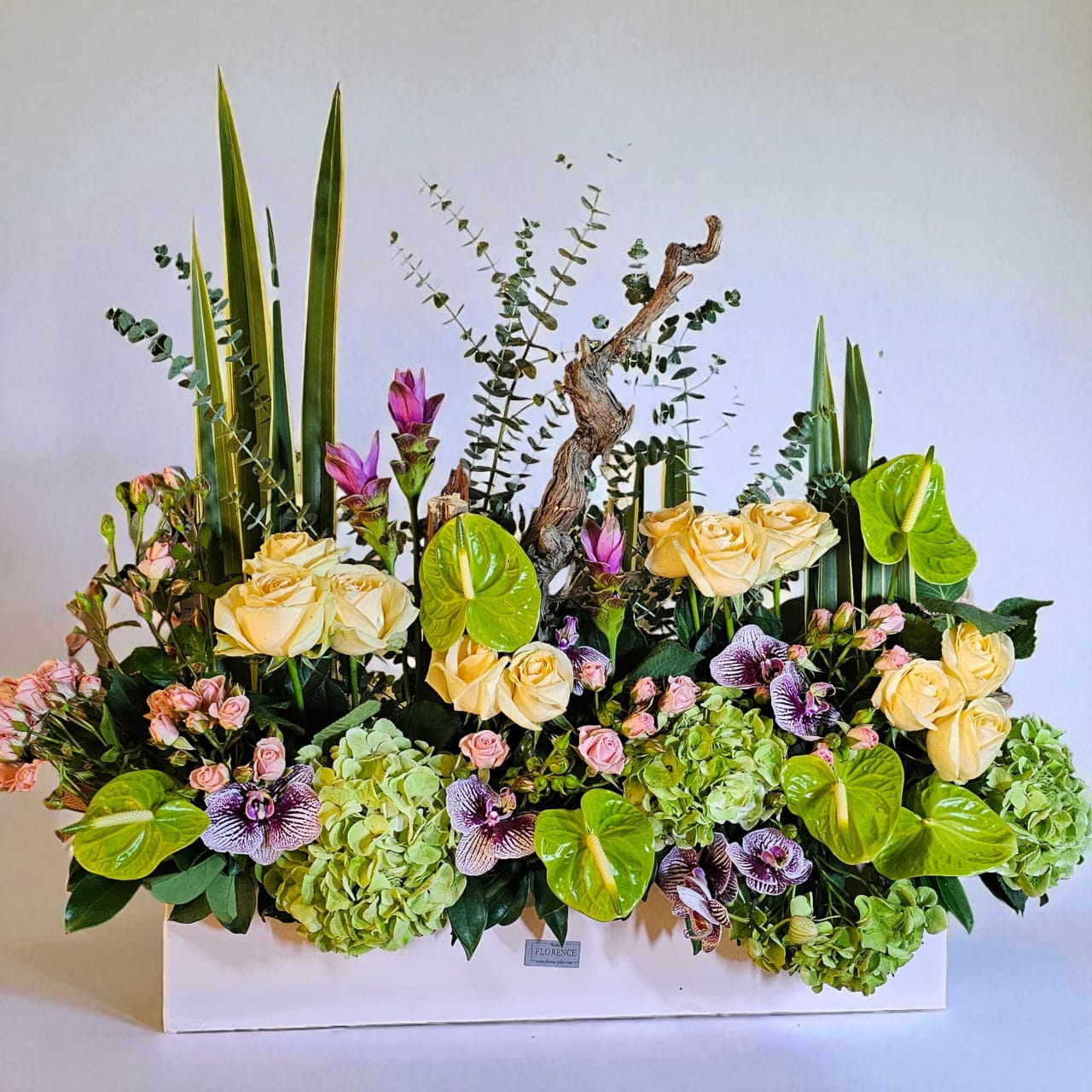 لیست گلهای استفادهشده و ظرف استفاده شده برای محصولدر طراحی این باکس گل از آنتریومهای سبز براق، هورتانزیاهای سبز روشن، رزهای کرم و زرد، ارکیدههای بنفش و گلهای ظریف صورتی استفاده شده است. همچنین برگهای بلند و شاخههای طبیعی جلوهای خاص به ترکیب دادهاند. ظرف این اثر هنری، یک باکس مستطیلی سفیدرنگ است که با سادگی خود اجازه میدهد رنگها و بافت گلها بیشتر بدرخشند. |