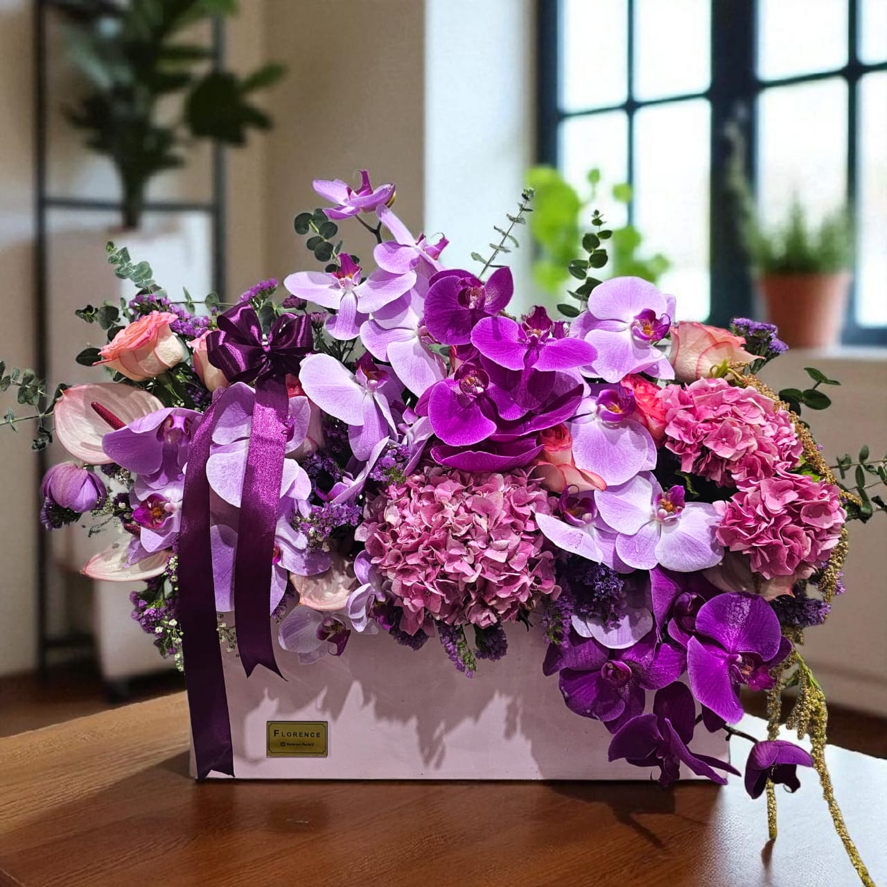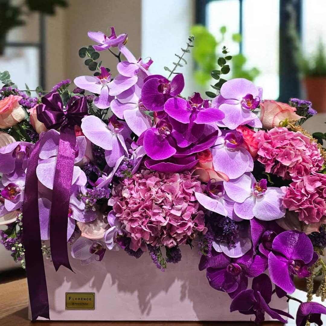باکس گل ارکیده هورتانزیا با طراحی شیک و رنگ‌های دلنشین