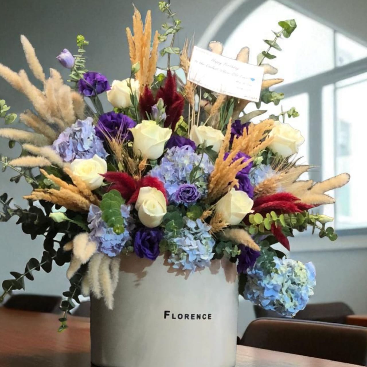 گلهای تازه در ظرفی شیک و خاصدر این باکس گل، گلهای سفید و بنفش رنگ از جمله گلهای رز و هیدرانژیا به همراه علفهای خشک با رنگهای طلایی و قرمز ترکیب شدهاند. این ترکیب رنگها همراه با ظرف سفید و ساده، ظاهری کلاسیک و در عین حال مدرن به آن بخشیده است. |