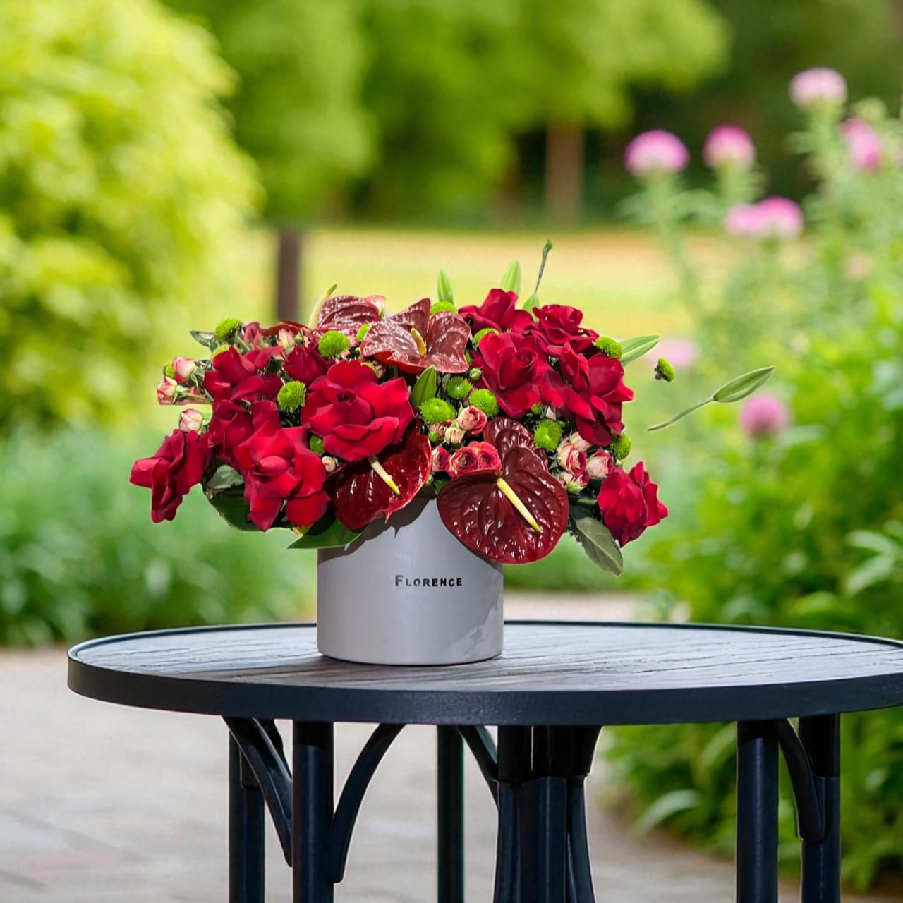باکس گل رومیزی زرشکی با گل‌های رز و طراحی مینیمال