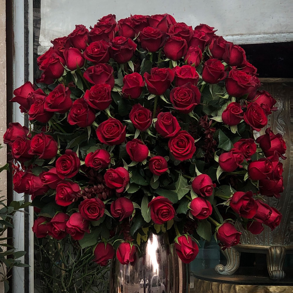 ترکیب رنگ و سبکرنگ قرمز رزها در کنار فینیش براق گلدان برنزی، حسی از وقار، شور و عشق را همزمان تداعی میکند. گلها به شکل کروی و کاملاً متقارن آرایش داده شدهاند که حالتی سلطنتی و باشکوه ایجاد میکند. این سبک گلآرایی مناسب فضاهای کلاسیک، رسمی و دکورهای لوکس است. |