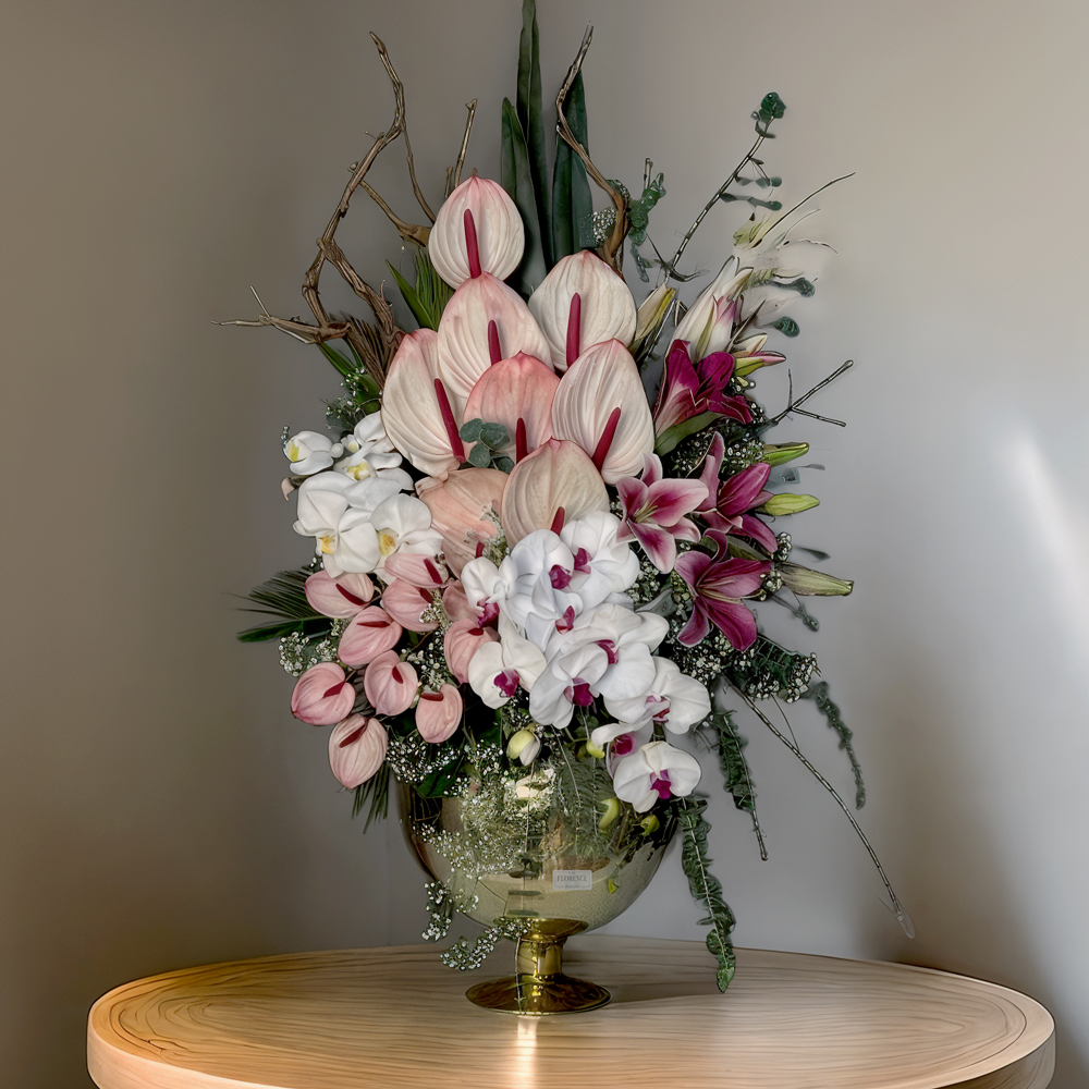 ترکیب رنگ و سبکاین گلآرایی با سبک نیمهکلاسیک و الهامگرفته از طبیعت، ترکیبی متعادل از رنگهای ملایم صورتی، کرم، سفید و بنفش دارد. شاخههای چوبی خشکشده، به حس هنری آن عمق بیشتری میبخشند. فرم عمودی و باز این گلآرایی، آن را برای مکانهای لوکس و مراسم رسمی بسیار مناسب کرده است. |