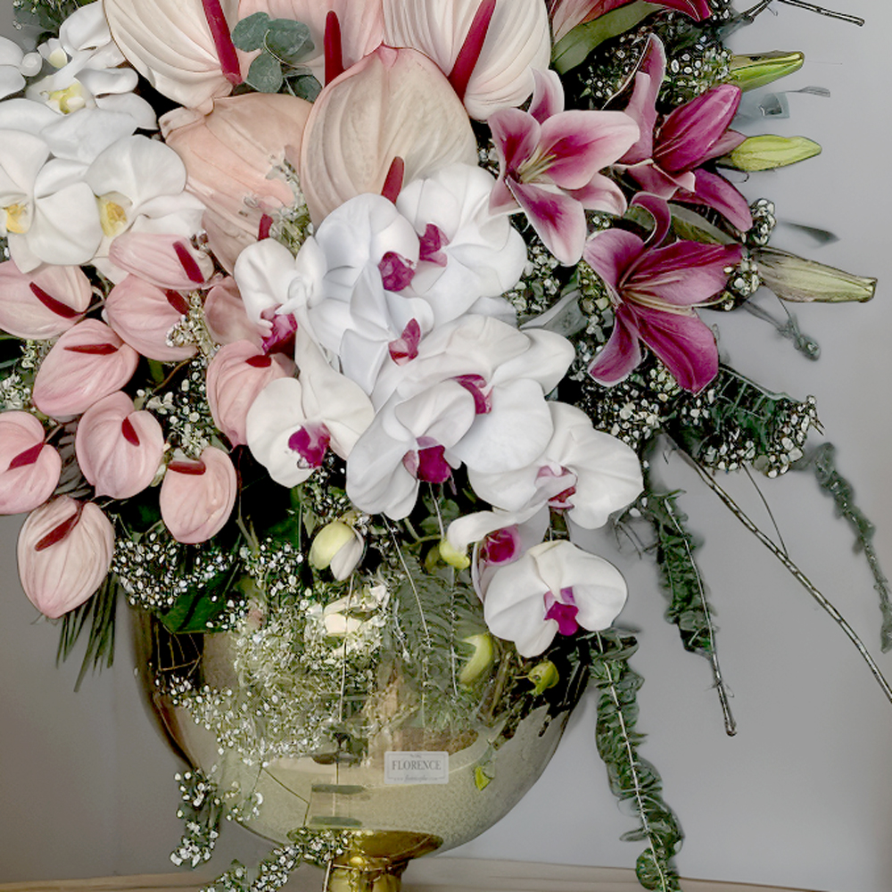 لیست گلهای استفادهشده و ظرف استفاده شده برای محصولدر این دیزاین، گلهای آنتوریوم صورتی و کرم با فرم خاص و مدرن، ارکیده سفید با رنگهای بنفش در دل خود، گلهای شیپوری، لیلیومهای بنفشمائل به قرمز و چندین شاخه از شکوفههای بهاری و اکالیپتوسهای معطر بهکار رفتهاند. هر گل بهصورت هماهنگ در کنار دیگری چیده شده تا یک هارمونی بینظیر شکل بگیرد. ظرف این اثر، یک گلدان بلوری طلاییرنگ پایهدار است که بازتاب نور و لطافت گلها را چندین برابر میکند. |
