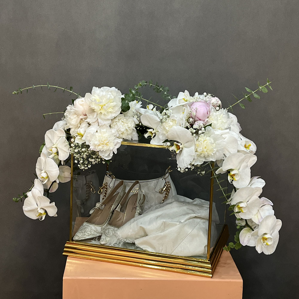 ترکیب گلهای سفید و صورتی در ظروف شیشهای طلاییدر این ست، از گلهای ارکیده سفید، رز صورتی، و گلهای ظریف ژیپسوفیلا استفاده شده است که با رایحه لطیف و ظاهر فوقالعادهشان، فضای رومانتیکی ایجاد کردهاند. ظروف طلاییشیشهای با طراحی مربعی، جذابیت محصول را دوچندان کردهاند و نمایی سلطنتی به آن بخشیدهاند. ترکیب گلها و جنس ظروف باعث شده است تا این محصول بسیار چشمنواز و خاص باشد. |