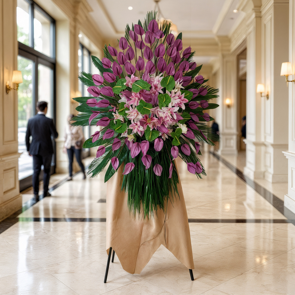 ترکیب رنگ و سبکترکیب رنگهای بنفش و سفید در این تاج گل لابی فلورانس بسیار زیبا و مدرن است. گلآرایی آن با سبک مینیمال و کلاسیک ترکیب شده که برای هر مکانی مناسب است. طراحی ساده و در عین حال تاثیرگذار این تاج گل باعث میشود هر کسی که وارد فضا میشود، از زیبایی آن شگفتزده شود. |
