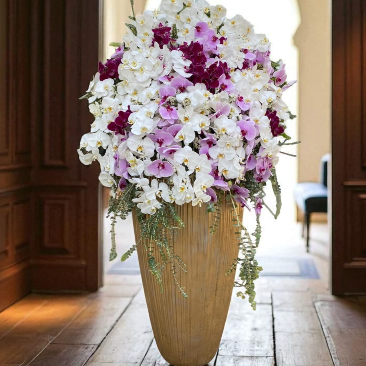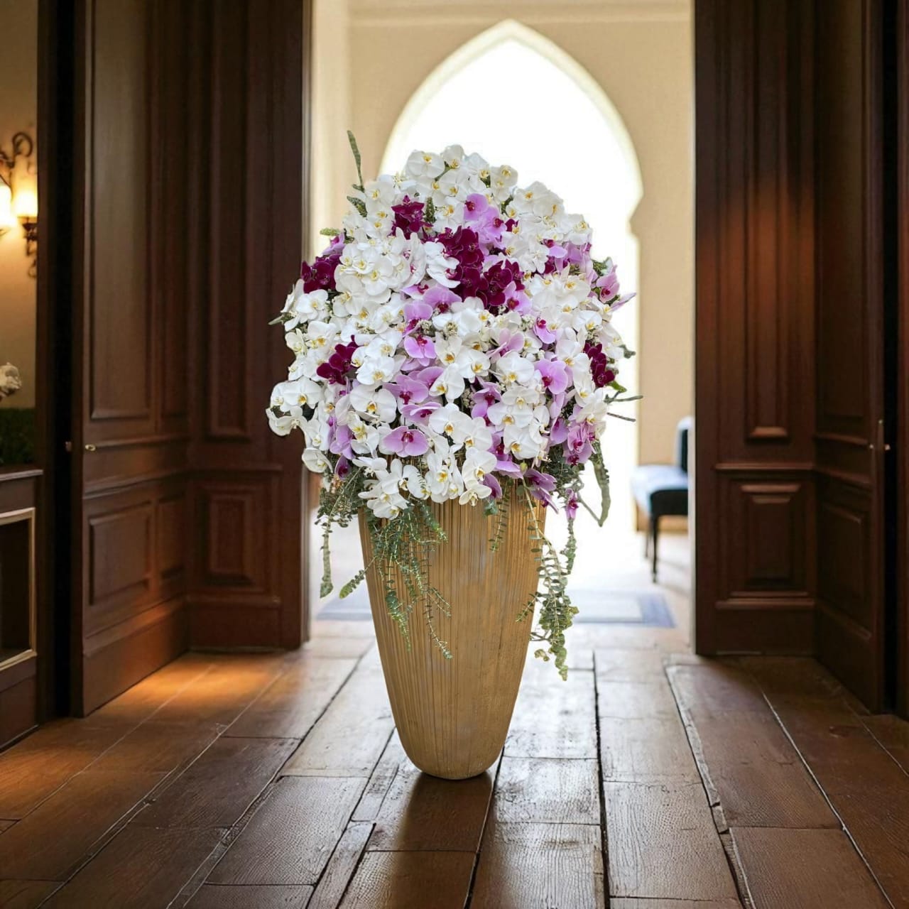 ترکیب رنگ و سبکترکیب رنگهای سفید و بنفش در کنار طراحی طلایی این محصول، جلوهای کلاسیک و در عین حال مدرن به آن میدهد. گلآرایی با سبک مینیمالیستی و استفاده از گلهای ارکیده ظرافت و زیبایی را به فضا میآورد. |