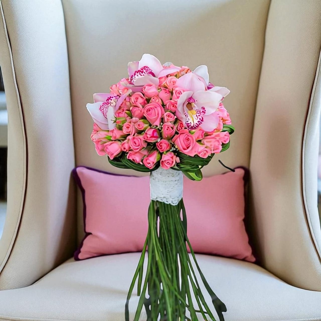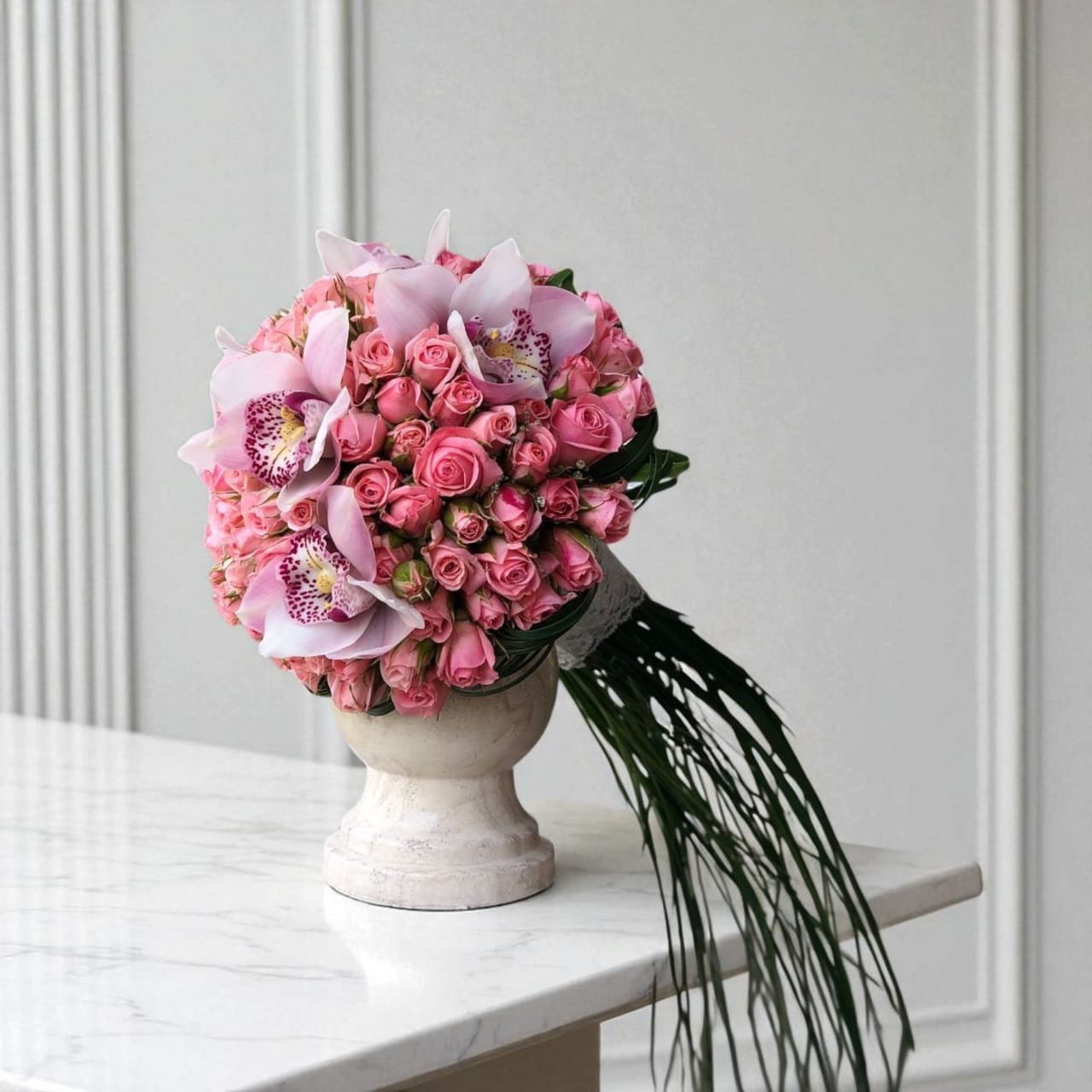 ترکیب رنگ و سبکرنگهای صورتی و کرمی در این دسته گل به خوبی با هم ترکیب شدهاند. گلهای رز صورتی با ارکیدههای نرم و زیبا، بهخوبی هماهنگ و هارمونی آرامی ایجاد میکنند. این طراحی میتواند هم برای عروسیهای کلاسیک و هم برای عروسیهای مدرن و شیک بسیار مناسب باشد. |