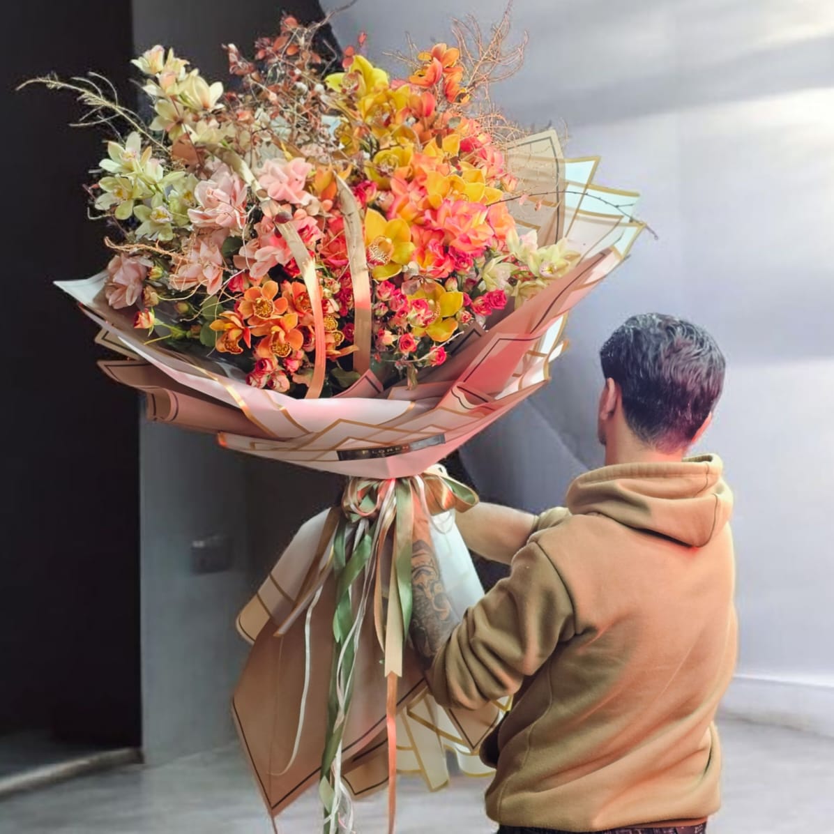 دسته گل غول پیکر رز و ارکیده سیمبیدیم خران مناسب جشن‌ها و هدیه عاشقانه