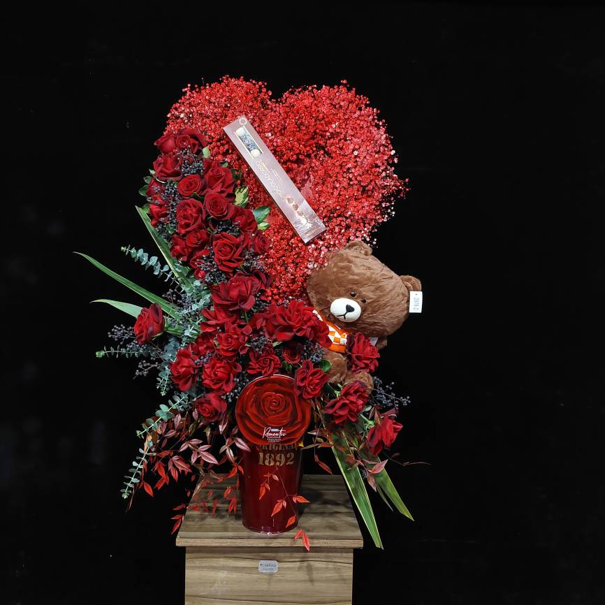 در این سطل قرمز، پانزده شاخه رز قرمز هلندی با ساقه بلند و گلبرگهای مخملی جا خوش کردهاند. هر رز یک پیام دارد، یک راز، یک «دوستت دارم». پانزده رز یعنی من تو را میپرستم. در باکس سطلی ولنتاین فلورانس، رزها تنها نیستند؛ گلهای فصلی سفید و صورتی دورتادورشان را گرفتهاند، سبزیهای معطر از لابهلایشان سرک کشیدهاند. اما همه میدانند، ستارههای این سطل فقط رزهای قرمزند. آنها هستند که میدرخشند، آنها هستند که عطر دلربا دارند، آنها هستند که حرف دل تو را میزنند.