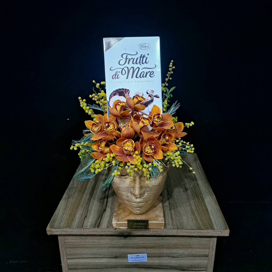 ارکیده سیمبیدیوم نارنجی در این ست، حکم آتش را دارد. رنگ نارنجی، رنگ شور، هیجان، خلاقیت و انرژی مثبت است. این ارکیده با گلبرگهای ظریف و رنگ گرمش، به صورتک رازآلود انرژی میدهد، زندگی میبخشد، شور میافزاید. در ست صورتک و ارکیده ولنتاین فلورانس، این گل زیبا با تکنیک پایدارسازی یا به صورت طبیعی، در کنار صورتک میدرخشد و تا هفتهها و ماهها مهمان خانه عزیزت میماند. ارکیده نارنجی یعنی من برایت هم شور دارم، هم زندگی. یعنی بودن با تو هرگز خستهکننده نیست.