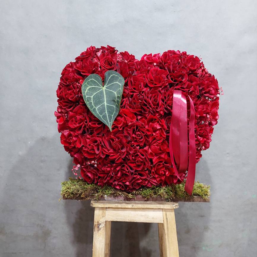 قلب ساخته شده از گل رز قرمز تازه با طراحی هنرمندانه، معروف به قلب رز ولنتاین.