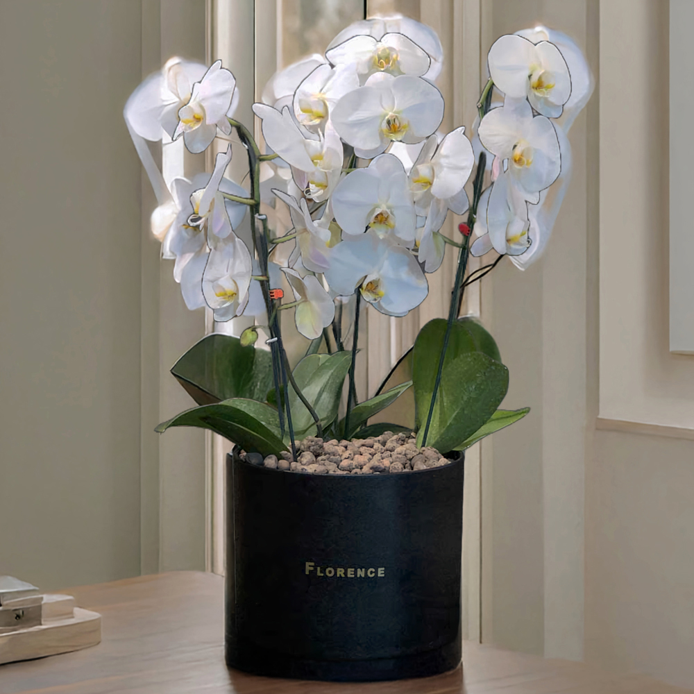 ارکیدههای سفید در گلدان سرامیکی مشکی Florenceدر این مجموعه از گلهای ارکیده سفید بهره برده شده که هر یک نمادی از خلوص، احترام و جاودانگی هستند. این گلهای شکوهمند درون گلدانی مشکی از برند Florence قرار گرفتهاند که با نوشتهی طلایی خود، حس وقار و لوکسی را القا میکند. ترکیب رنگ مشکی و سفید، به صورت چشمنوازی با هم تلفیق شدهاند تا زیبایی خالصی را در کنار معنا خلق کنند. |