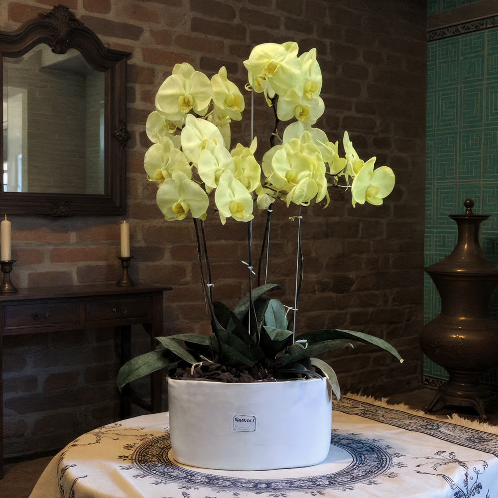ترکیب رنگ و سبکرنگ زرد ارکیدهها، انرژیبخش و درخشان، در کنار برگهای سبز تیره و گلدان سفید، ترکیبی کاملاً متعادل و مدرن ساخته است. سبک گلآرایی بر پایه نظم طبیعی و تقارن طراحی شده که هم برای فضاهای رسمی و هم غیررسمی مناسب است. این مجموعه برای دکوراسیون مینیمال، کلاسیک یا حتی لوکس، کاملاً ایدهآل است. |