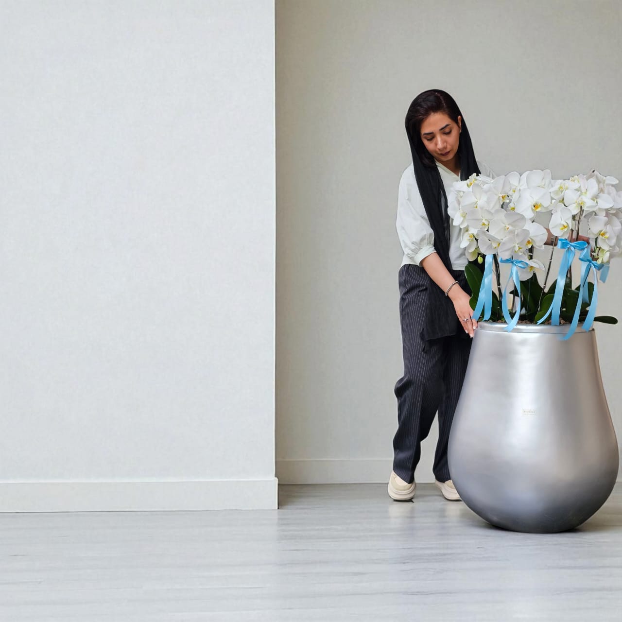ترکیب ساده و شیکترکیب گلهای ارکیده سفید با ربانهای آبی رنگ، یک هماهنگی رنگی ملایم و شیک ایجاد کرده است که حس آرامش و زیبایی را منتقل میکند. این گلدان با طراحی مینیمالیستی خود، هارمونی زیبایی را در محیط بهوجود میآورد و بهطور خاص برای فضاهای مدرن و کلاسیک مناسب است. |