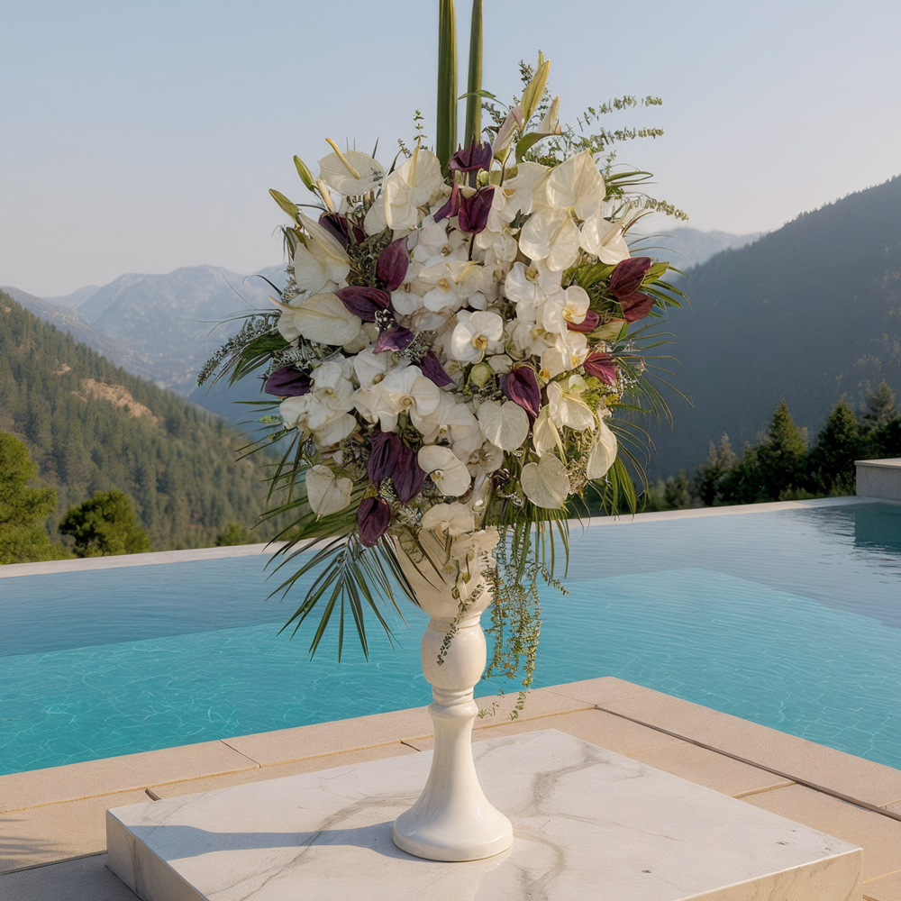 لیست گلهای استفادهشده و ظرف استفادهشده برای محصولگلهای سفید و بنفش از جمله ارکیده، لاله و سایر گلهای ظریف بهدقت انتخاب شدهاند تا شگفتانگیزترین ترکیب را برای لحظات خاص ایجاد کنند. ظرف این گلدان، یک پایه سفید و شیک است که گلها را به زیبایی در خود جای میدهد و به جلوهای مدرن و کلاسیک میبخشد. |