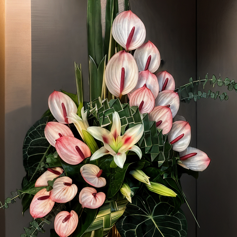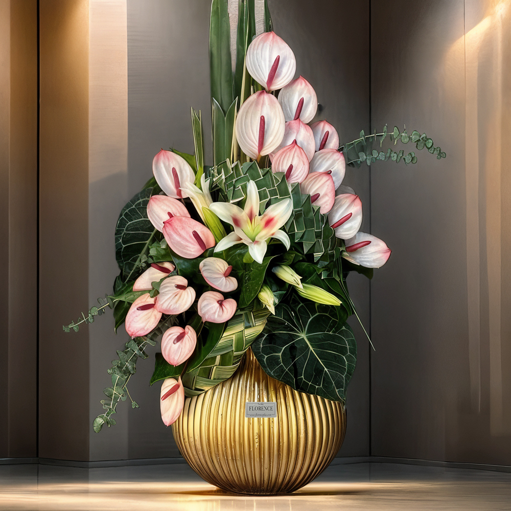 گلهای آنتوریوم، لیلیوم و برگآراییهای هنریاین گلدان شامل ترکیبی از آنتوریومهای صورتی، لیلیومهای سفید با رگههای صورتی و برگهای بزرگ سبز تیرهی دکوراتیو است که با هنر دست گلآرایان فلورانس در کنار هم قرار گرفتهاند. ظرف این گلآرایی، یک گلدان فایبرگلاس طلایی رنگ و شیاردار است که نام برند فلورانس با اصالت روی آن نصب شده. درخشش ظرف، در کنار طراوت گلها، ترکیبی دلنشین و لوکس خلق کرده است. |