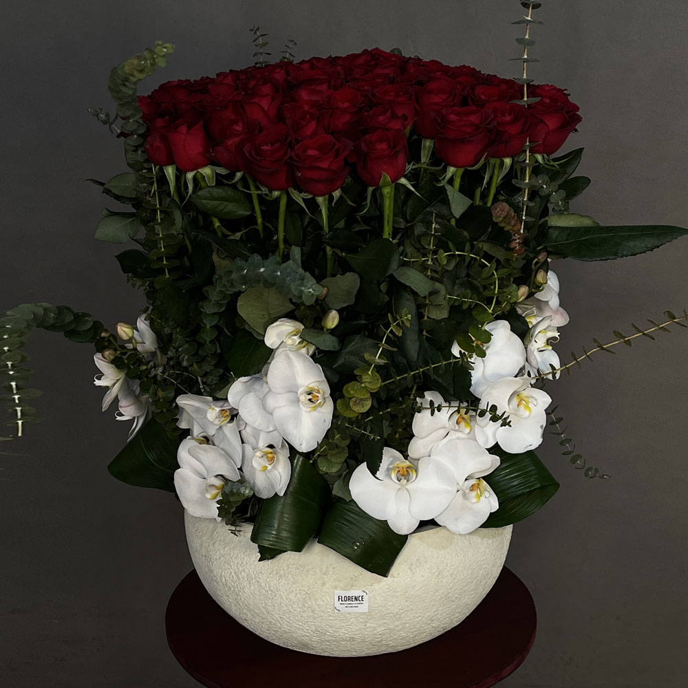 لیست گلهای استفادهشده و ظرف استفاده شده برای محصولدر گل شب ولنتاین از گلهای رز قرمز و ارکیده سفید با طراوت استفاده شده است. این ترکیب گلها با رنگهای جذاب و دلانگیز خود، حس عشق و زیبایی را بهطور خاص منتقل میکند. گلدان این محصول از سرامیک سفید و با بافتی خاص طراحی شده است که تضاد زیبایی با رنگهای گلها ایجاد کرده و جلوهای ویژه به این گلآرایی بخشیده است. |