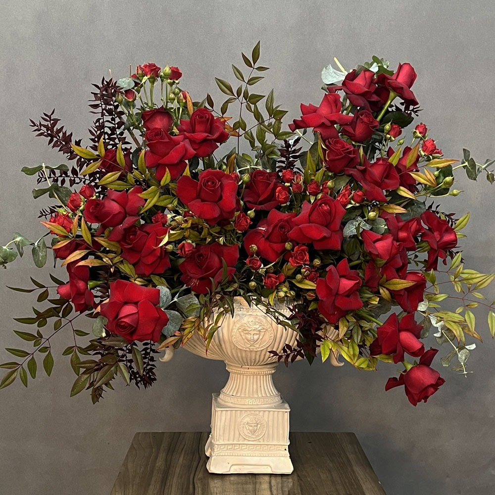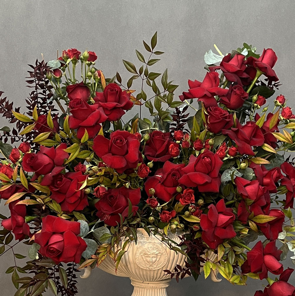 ترکیب رنگهای قرمز و سبز در یک طراحی لاکچریرنگ قرمز گلهای رز که نماد عشق و احساسات عمیق است، همراه با برگهای سبز و طلایی، یک هارمونی رنگی شیک و مجلل ایجاد میکند. این ترکیب باعث شده که گلآرایی محصول به یک اثر هنری بینظیر تبدیل شود که توجه هر بینندهای را به خود جلب میکند. |