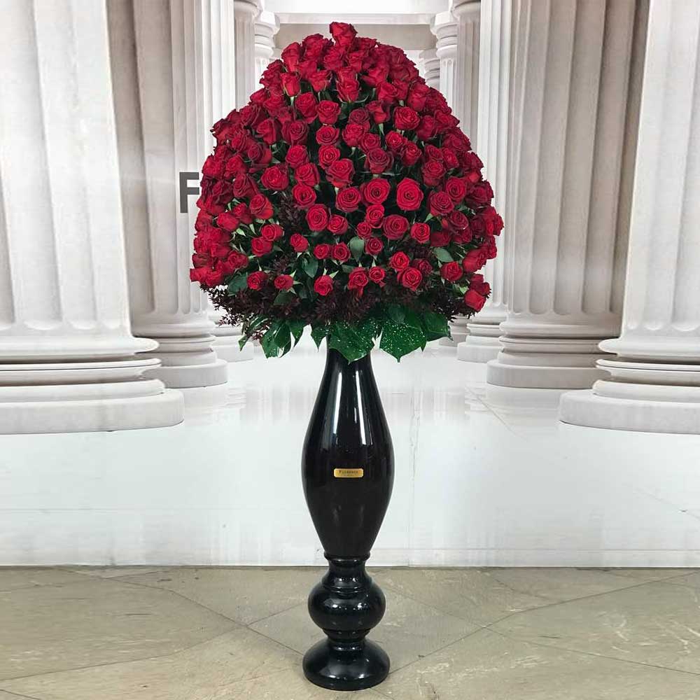 گل کاسپین رز لوکس با طراحی مدرن و گل‌آرایی ویژه در باکس مخملی مشکی
